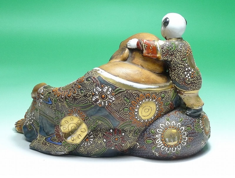 This Kutani Hotei with Karako figure is well suited for collectors of Japanese folk belief, narrative ceramic sculpture, and symbolic interior objects. Its relaxed composition and storytelling quality make it ideal for shelves, alcoves, or curated display groupings.