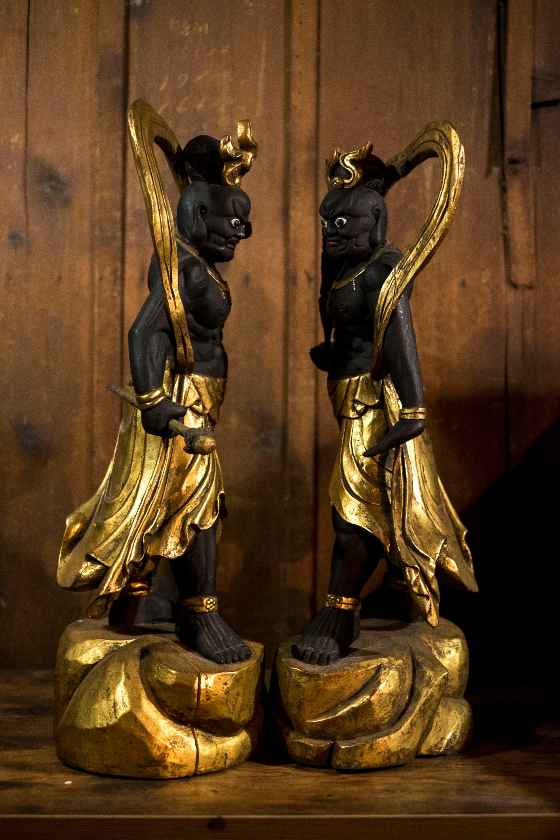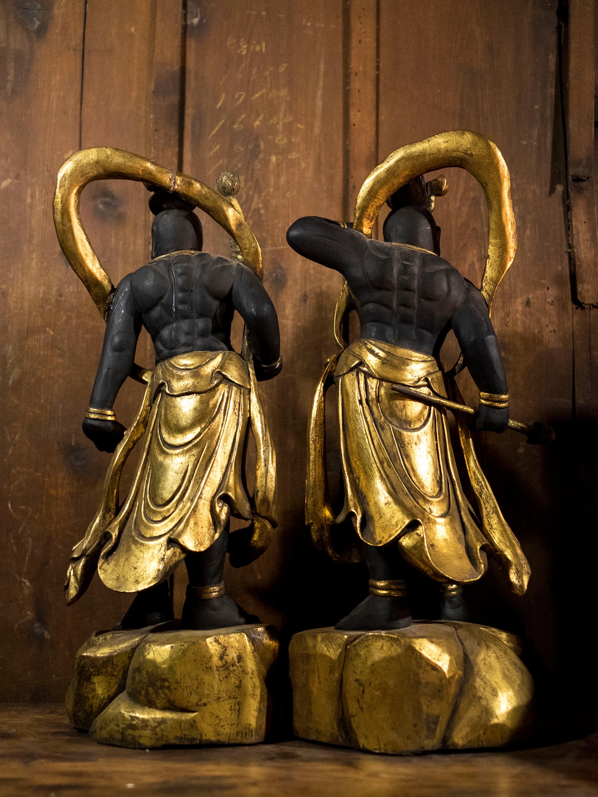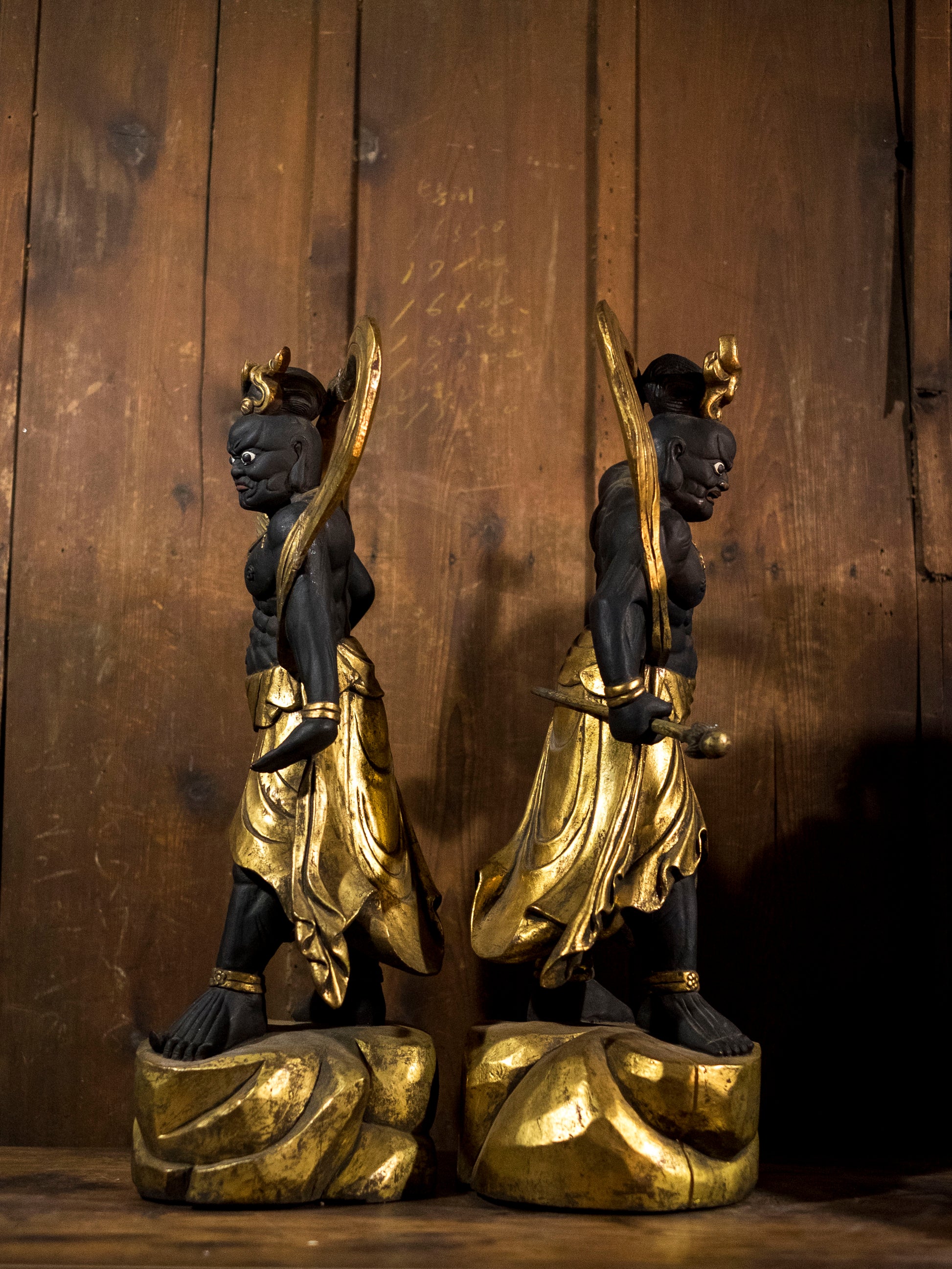Carved in solid wood and finished in blackened pigment with extensive gilt highlights, the figures echo Kamakura-period muscularity revived during the Shōwa era.