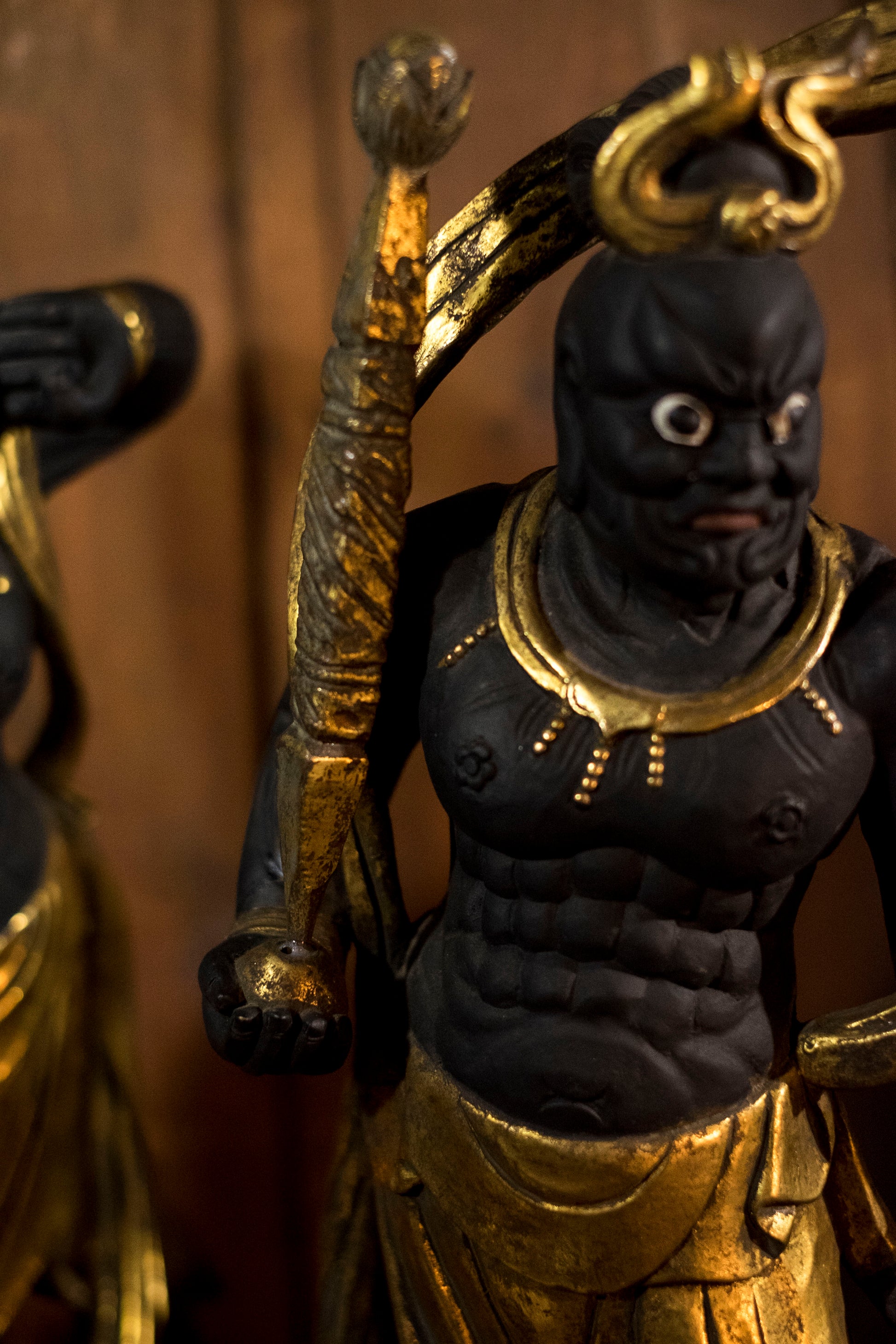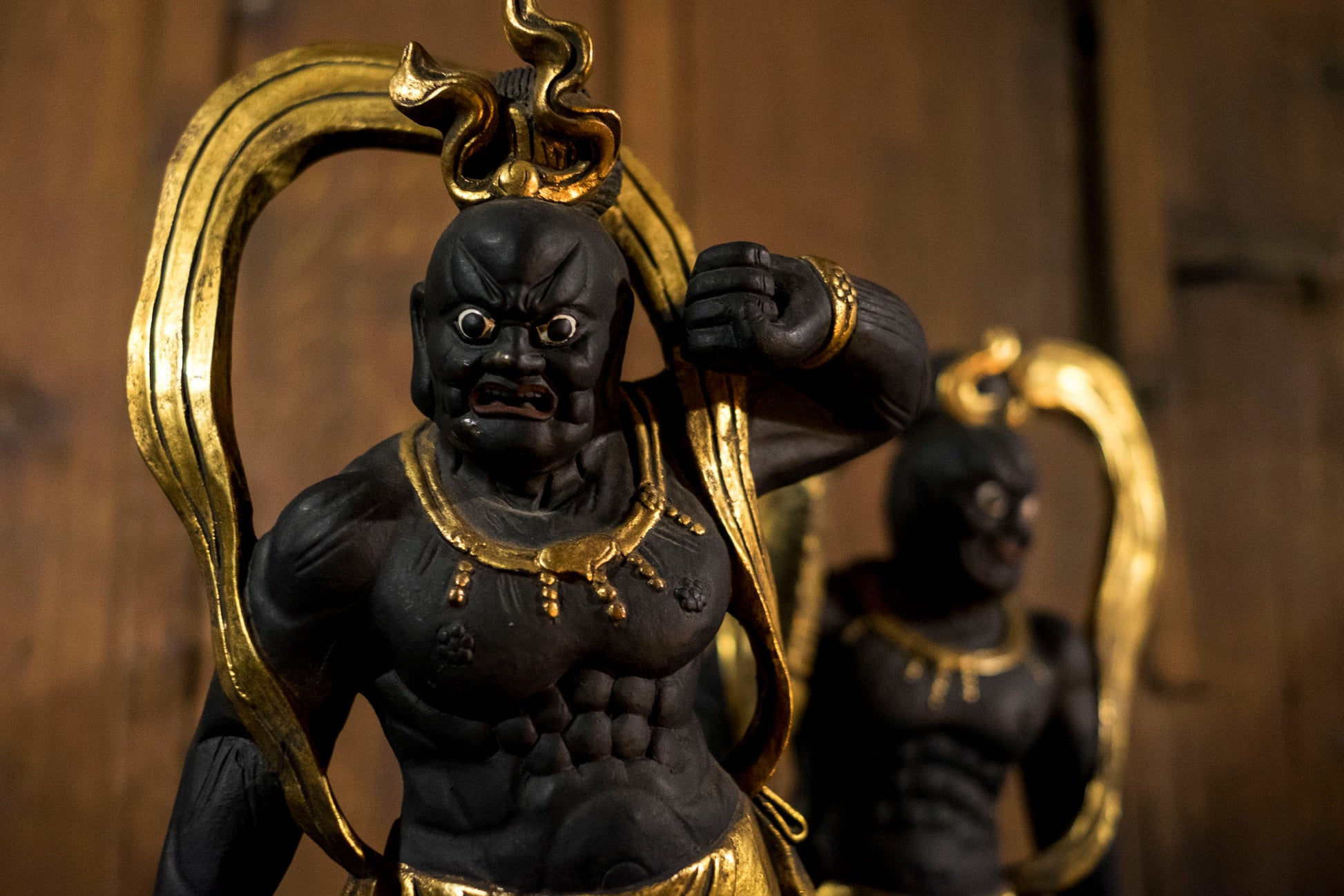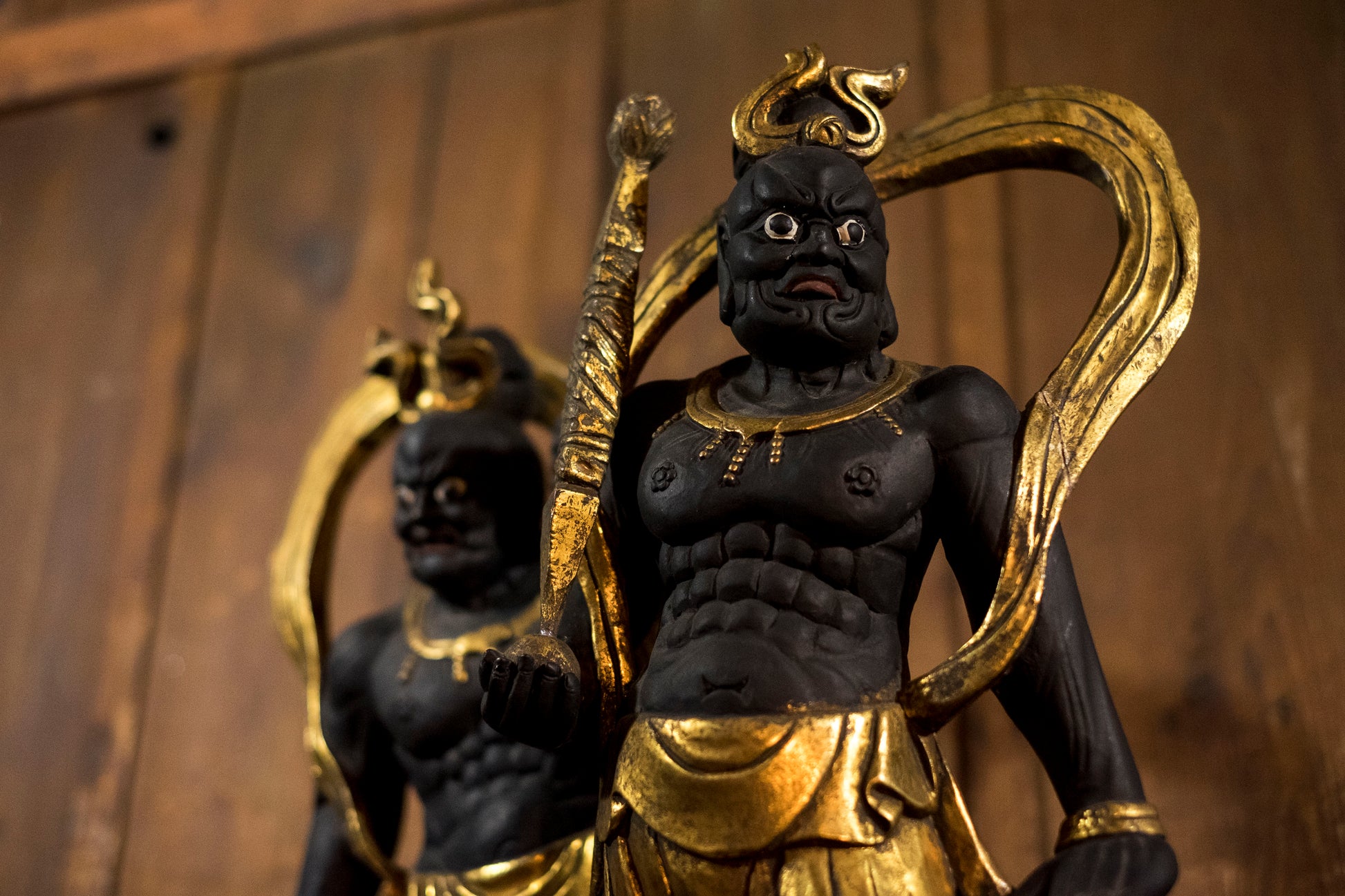Carved in solid wood and finished in blackened pigment with extensive gilt highlights, the figures echo Kamakura-period muscularity revived during the Shōwa era.