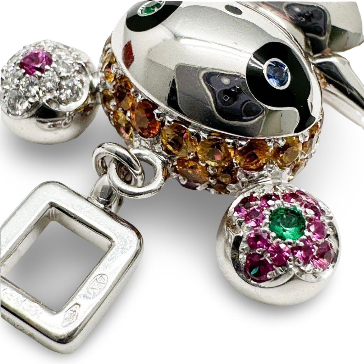 The Panda design is immediately recognizable—round, expressive, and irresistibly playful. Murakami’s beloved character is reimagined in precious materials, with jewel-set ears, vibrant gemstone eyes, and sculptural metalwork that gives the charm a delightful dimensionality. Even in miniature form, the Panda feels alive, like a precious art toy transformed into collectible jewelry. The high polish of the white gold enhances the visual contrast against the colored stones, making the piece glow under any light source.