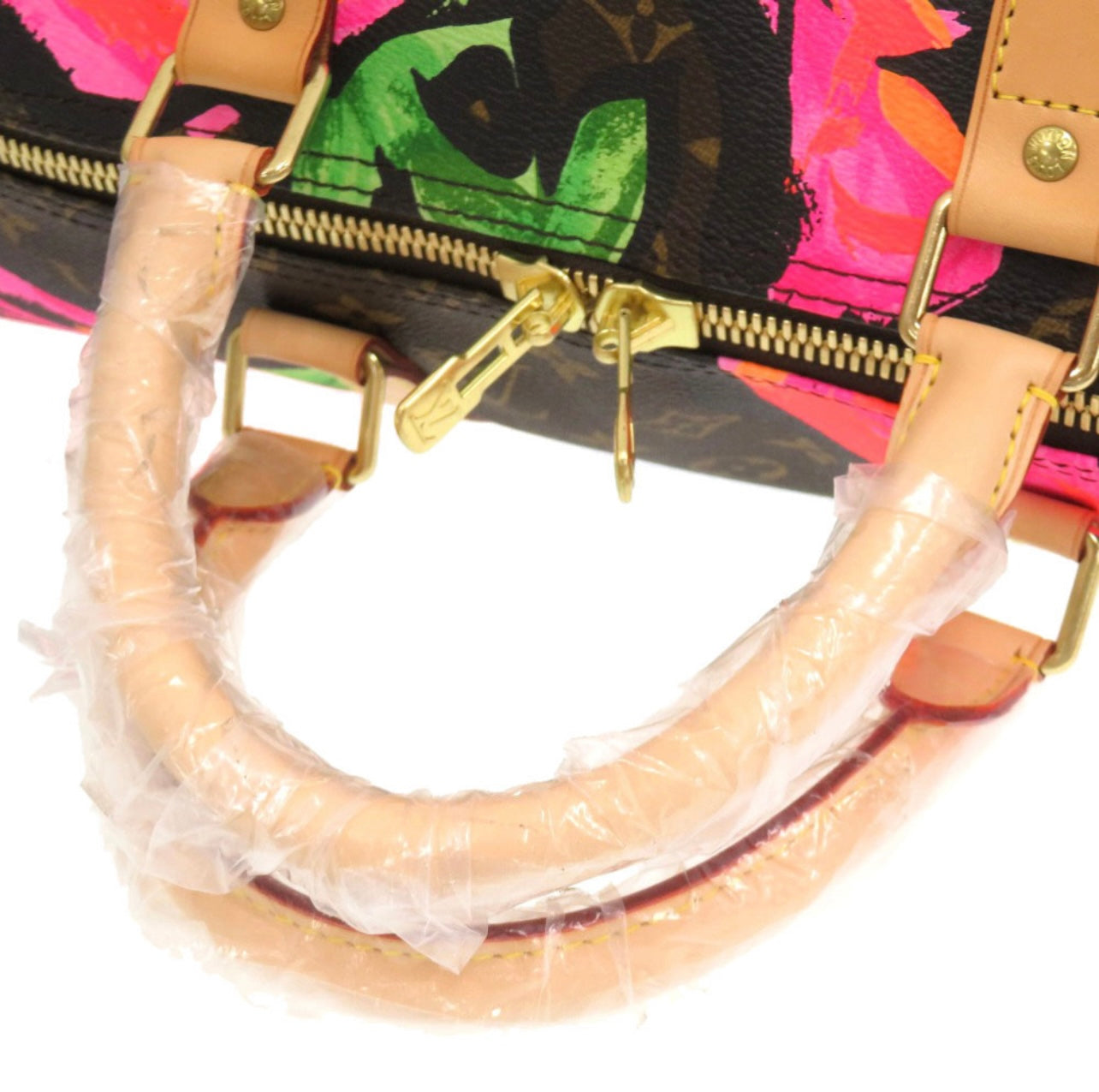 The Keepall 50 format reinforces its purpose: a functional, flexible, globetrotting companion crafted for collectors who value both elegance and history. Sprouse’s neon pink and orange roses erupt across the canvas with a hand-painted effect, creating an unmistakable contrast against the deep brown Monogram background. The natural Vachetta leather handles and trims bring structure and warmth, aging into a golden patina that adds character over time.