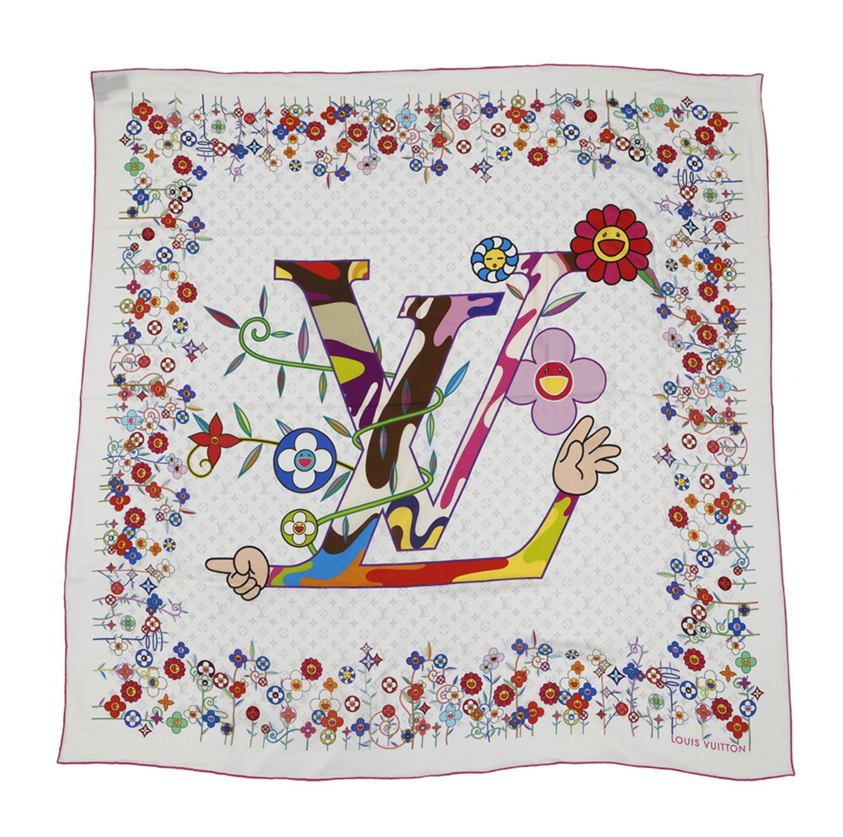 Along the entire border, a vibrant procession of Superflat flowers creates a lush frame that transforms the shawl into a living artwork. Every element — from the directional pointing hands to the expressive character blooms — reflects Murakami’s iconic merger of cute, surreal, and conceptual design.