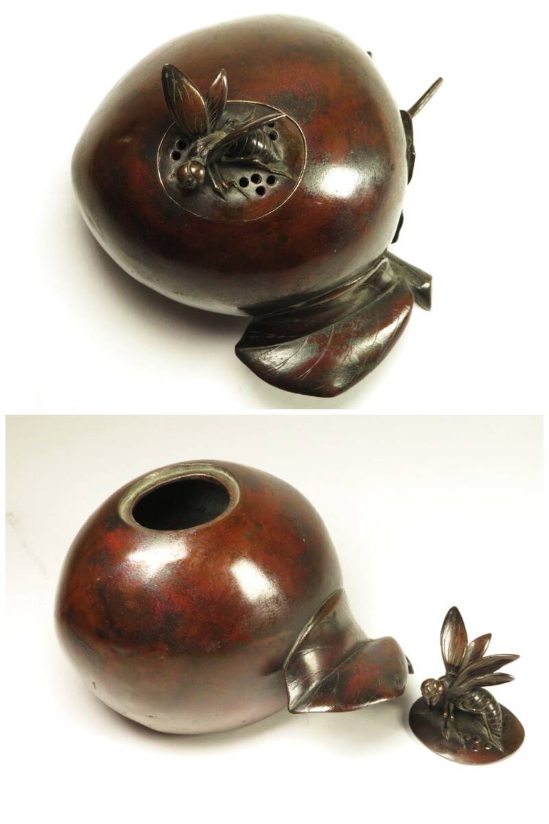 This refined Meiji-period incense burner is cast in the sculptural form of a ripe persimmon surmounted by a delicately modeled bee, a pairing that reflects the late nineteenth-century Japanese fascination with natural symbolism rendered through metalwork of high technical refinement.