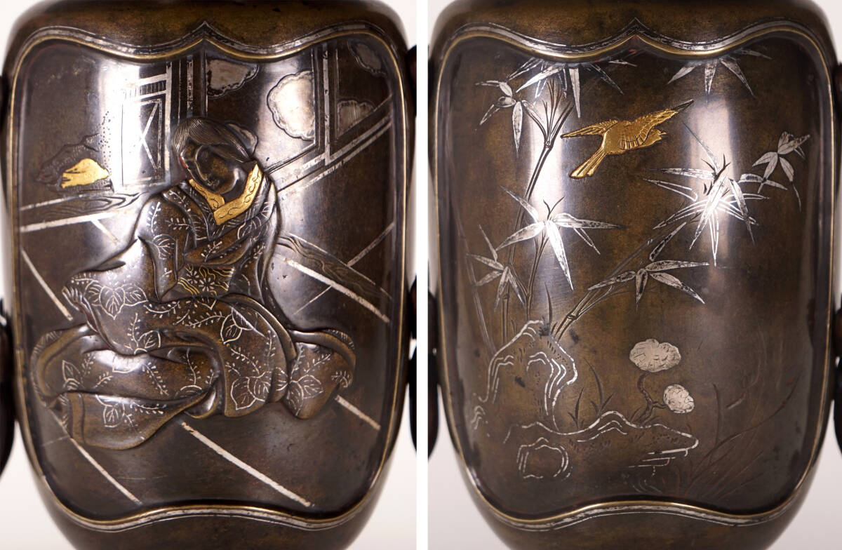 This monumental bronze vessel exemplifies the refined gravitas of late Meiji to Taisho-period Japanese metalwork, where technical mastery and pictorial storytelling converge. Rising with commanding verticality, the form is enriched by finely cast handles and meticulously inlaid panels depicting a contemplative scholar amid birds and bamboo—motifs long associated with cultivation, wisdom, and harmony.