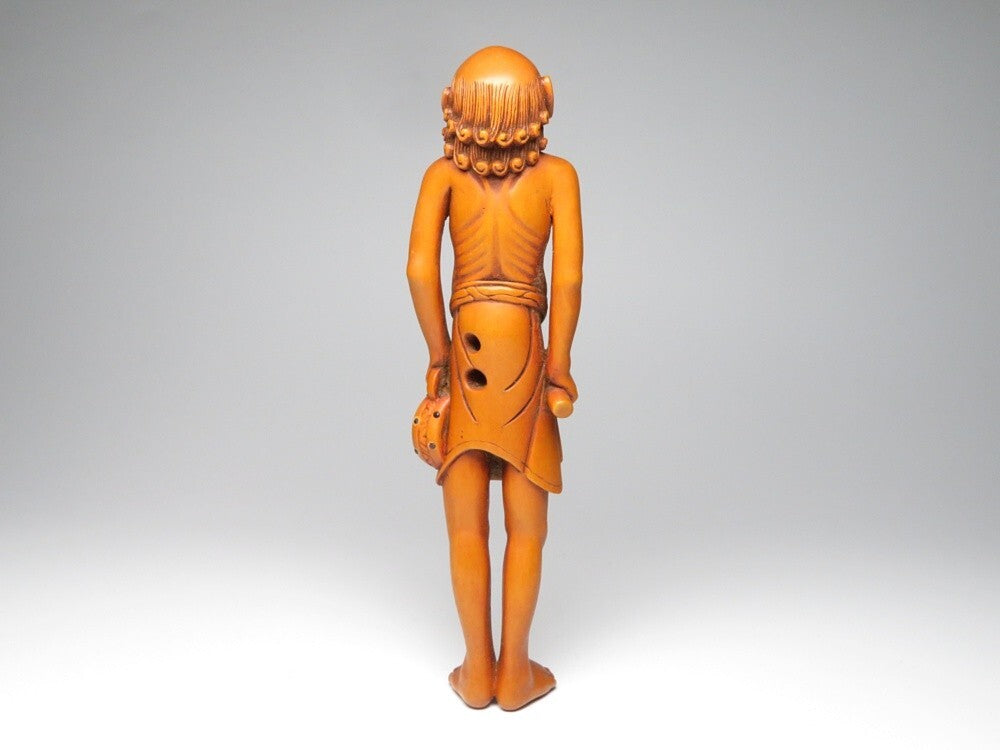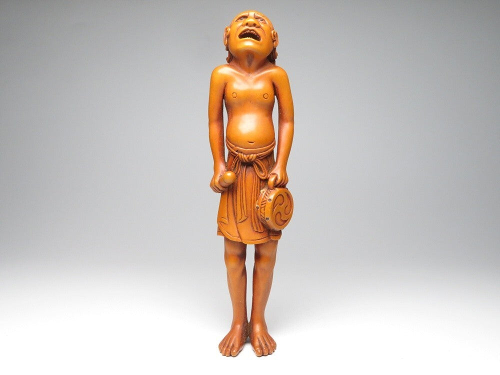 This finely carved wooden figure represents a Meiji-period interpretation of the netsuke tradition,