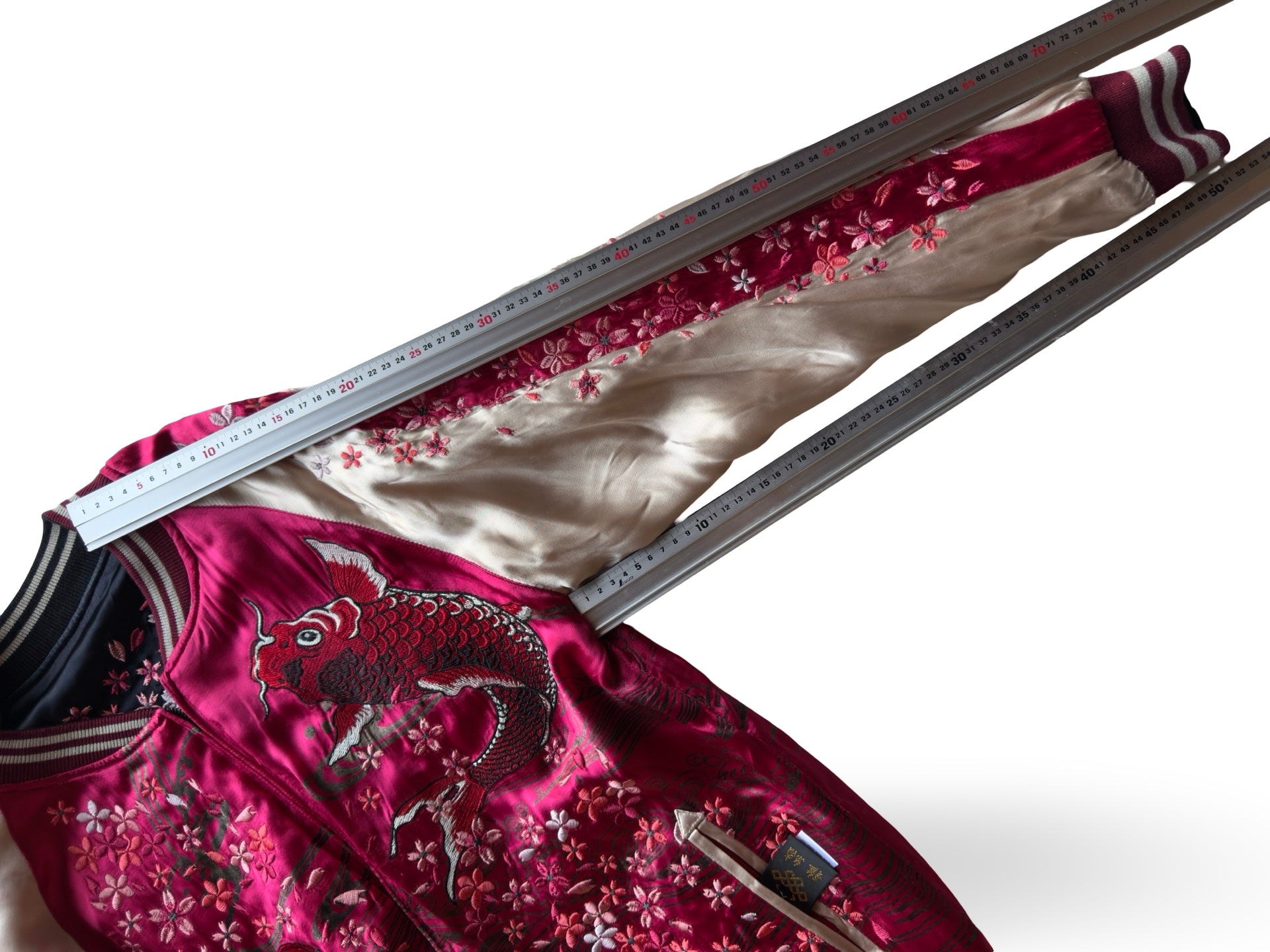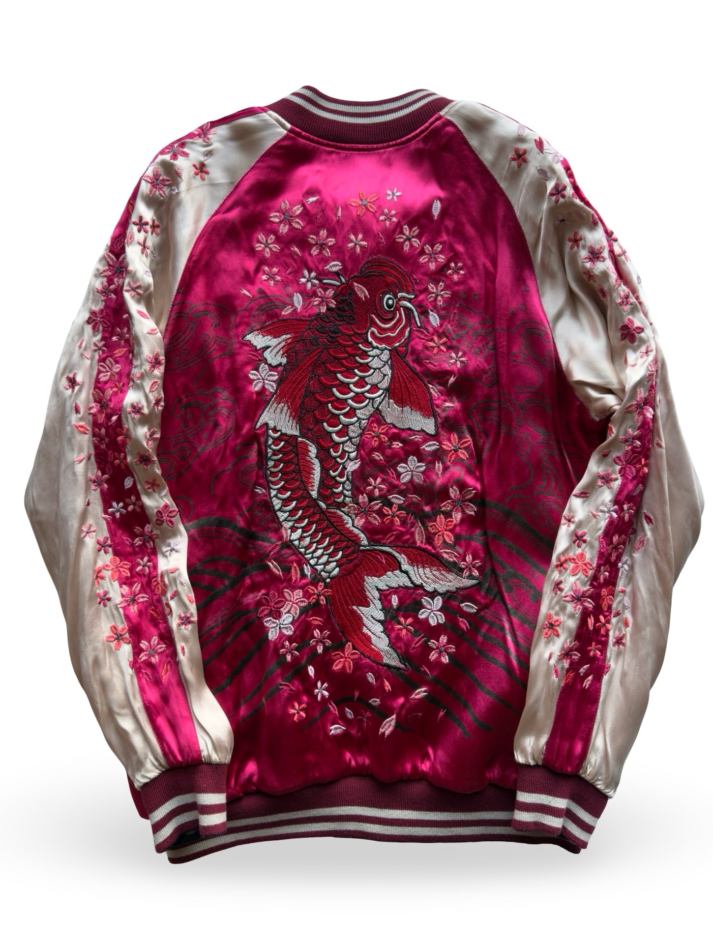 One side glows in a deep fuchsia satin, showcasing a powerful koi ascending upstream, a timeless symbol of perseverance, transformation, and triumph. The sleeves bloom with embroidered sakura clusters, adding softness and movement around the bold central motif.
