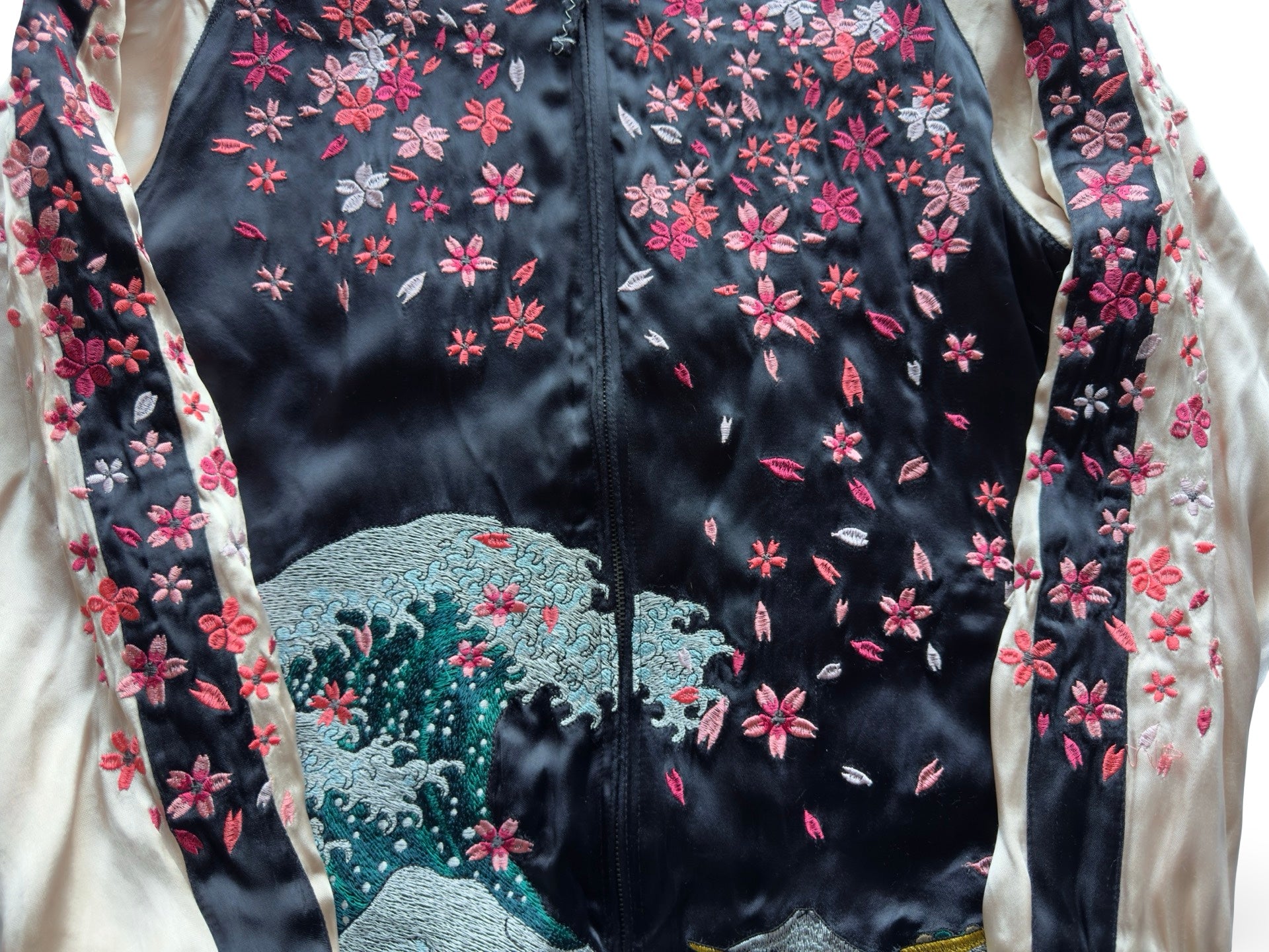 Reversed, the jacket reveals an entirely different world: a dramatic black satin field embroidered with swirling cherry blossoms falling over the Great Wave. The meticulous detailing—especially the jade-green waters, frothing crests, and tiny petals carried by the wind—creates a mesmerizing ukiyo-e tableau in motion.