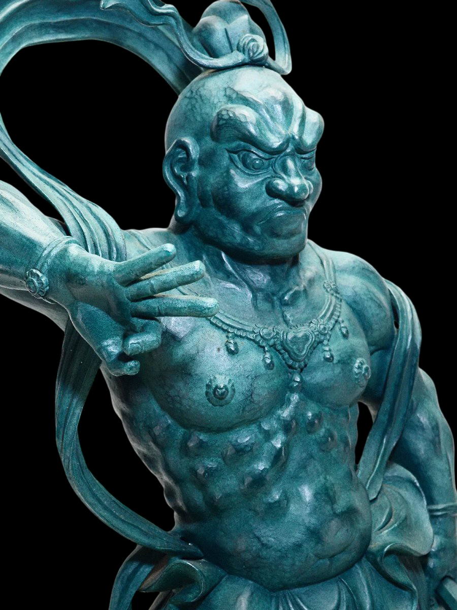 Attributed to the Matsuhisa Sohrin, known for monumental devotional sculpture in the modern era, these guardians demonstrate a masterful synthesis of classical temple iconography with robust, expressive casting. Each figure stands independently yet functions as part of a complete cosmological pair, traditionally placed at temple gates to ward off malevolent forces and spiritual corruption.