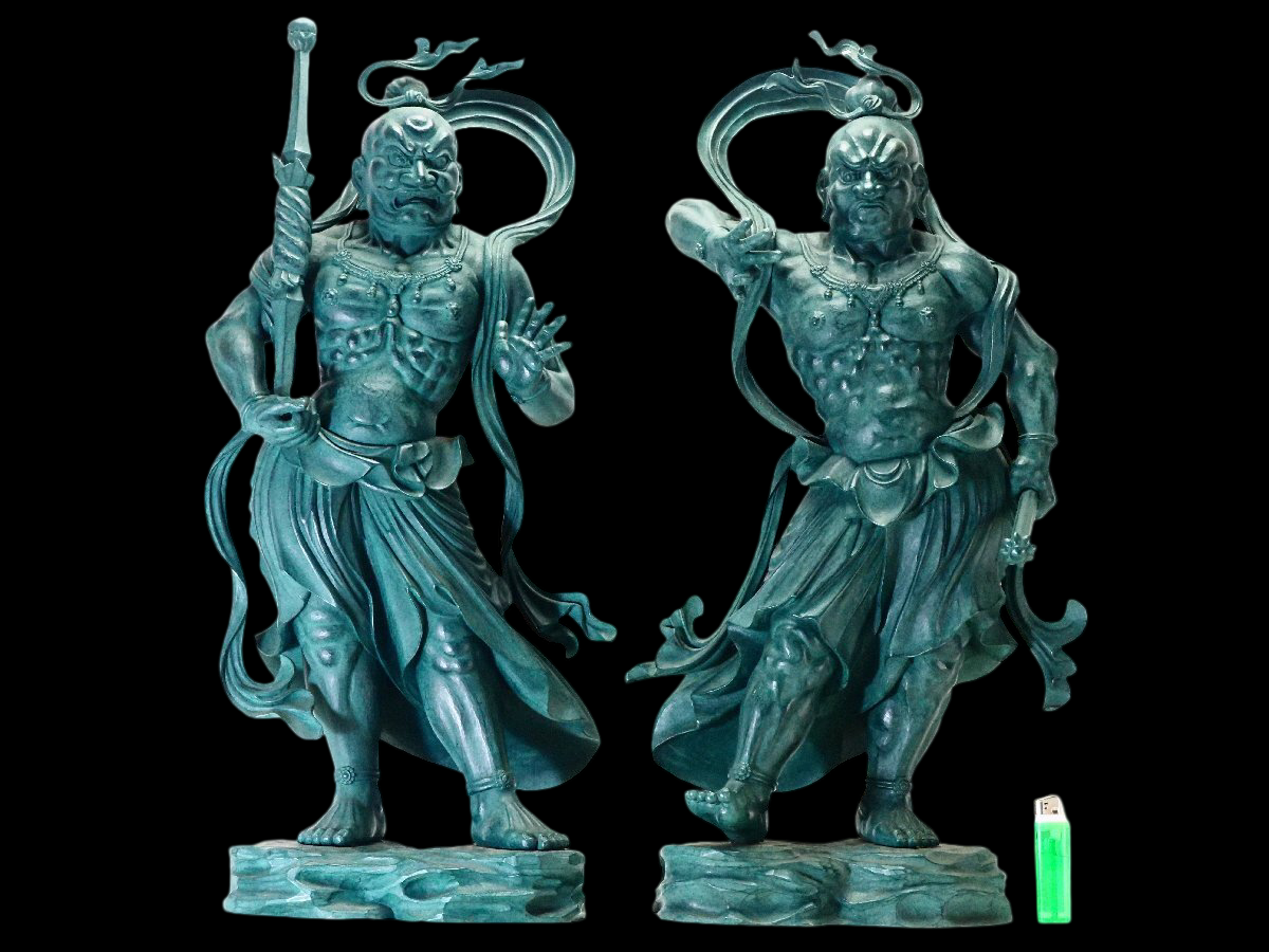 This commanding pair of Nio (Deva Kings), Agyō and Ungyō, represents one of the most powerful iconographic guardians in Japanese Buddhist sculpture. Cast in bronze with dynamic musculature and dramatic contrapposto movement, the figures embody the cosmic forces of birth and cessation, breath and silence, protection and wrath.