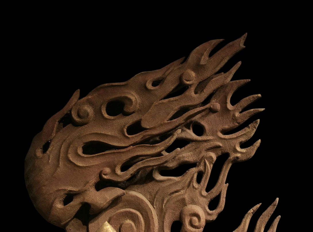 The sword symbolizes discriminating wisdom that cuts through obstruction; the rope represents disciplined containment—binding what must be restrained, drawing what must be guided. The flame mandorla is the visual doctrine of transformation, the burning away of ignorance into clarity. Temple-scale works that succeed often read quietly severe: authoritative without being noisy.