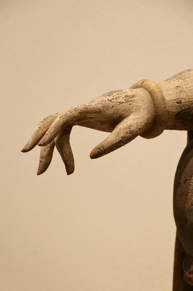Curatorial note: Monumental wooden sculptures require professional handling, climate control, and crated transport. Minor separations and surface wear are consistent with age.