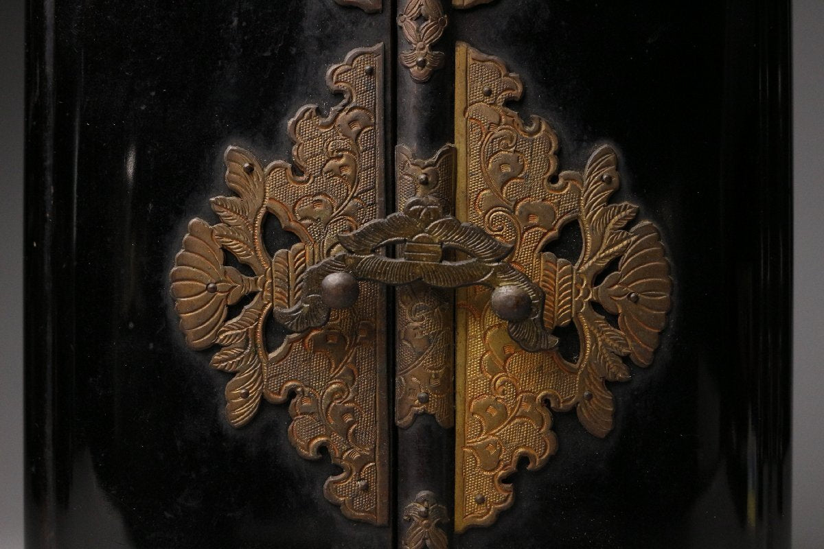 The exterior case presents as black lacquer with decorative metal fittings. In ritual interiors, black lacquer functions as controlled silence; metalwork acts as punctuation. Together they signal that this is sacred furniture, not a decorative box. The fittings also matter practically: they stabilize doors and edges across repeated opening cycles.