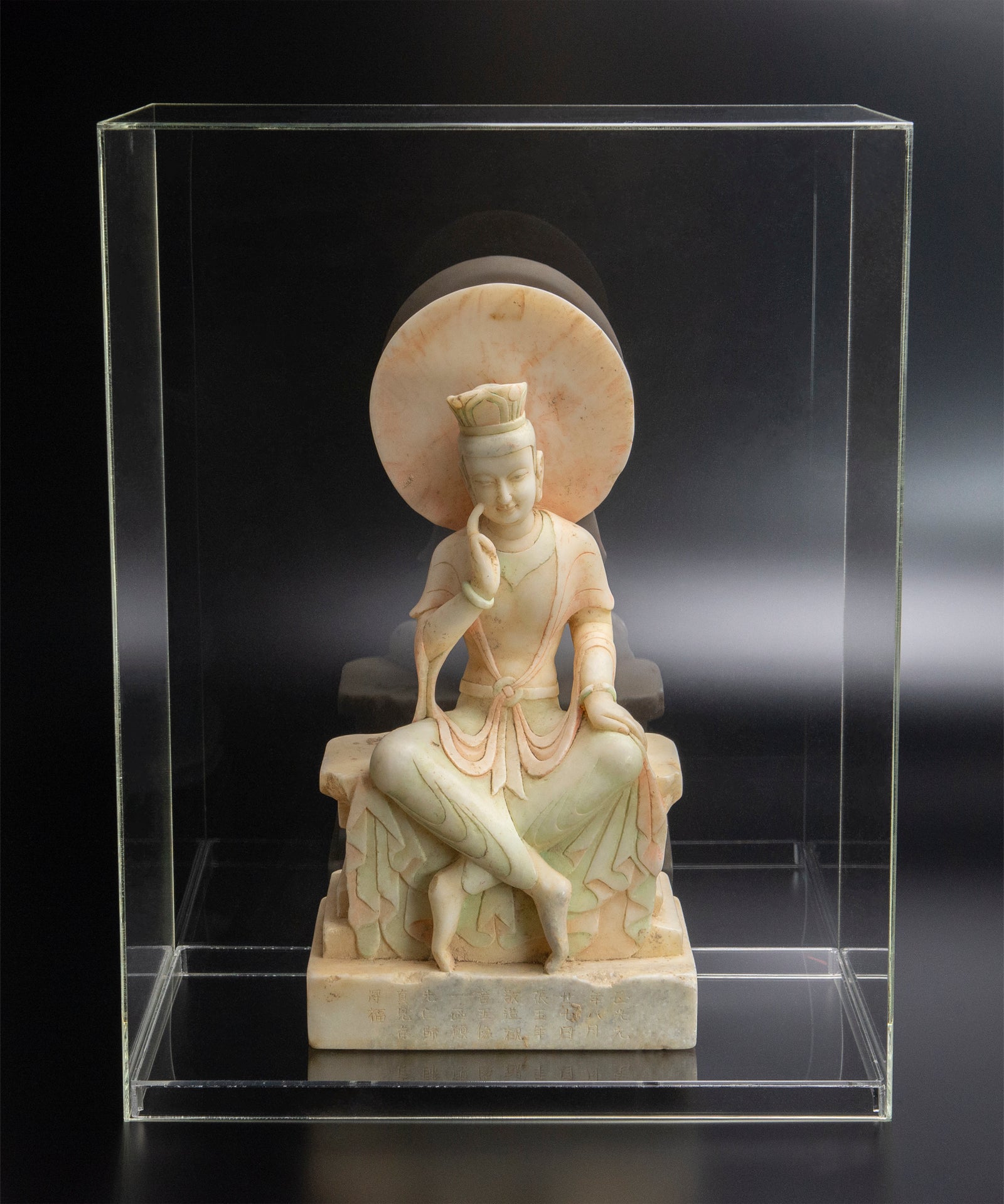 For an institution, the object’s value is legibility and teaching utility: scale sufficient for exhibition, a devotional subject that bridges Chinese Buddhist history and pan‑East Asian reception, and an object format (acrylic case) aligned with practical display safety. It can be positioned within a gallery narrative on Northern dynastic Buddhism, on the material culture of jade in religious practice, or on the migration of iconographic forms into Japanese collecting contexts. Where institutions require certainty, we recommend a pre‑acquisition assessment (gemological confirmation of jade species, UV / microscopy surface read, and an epigraphic review of the inscription and accompanying papers). The object’s presentability and documentary inclusions make it a strong candidate for scholarly stewardship.