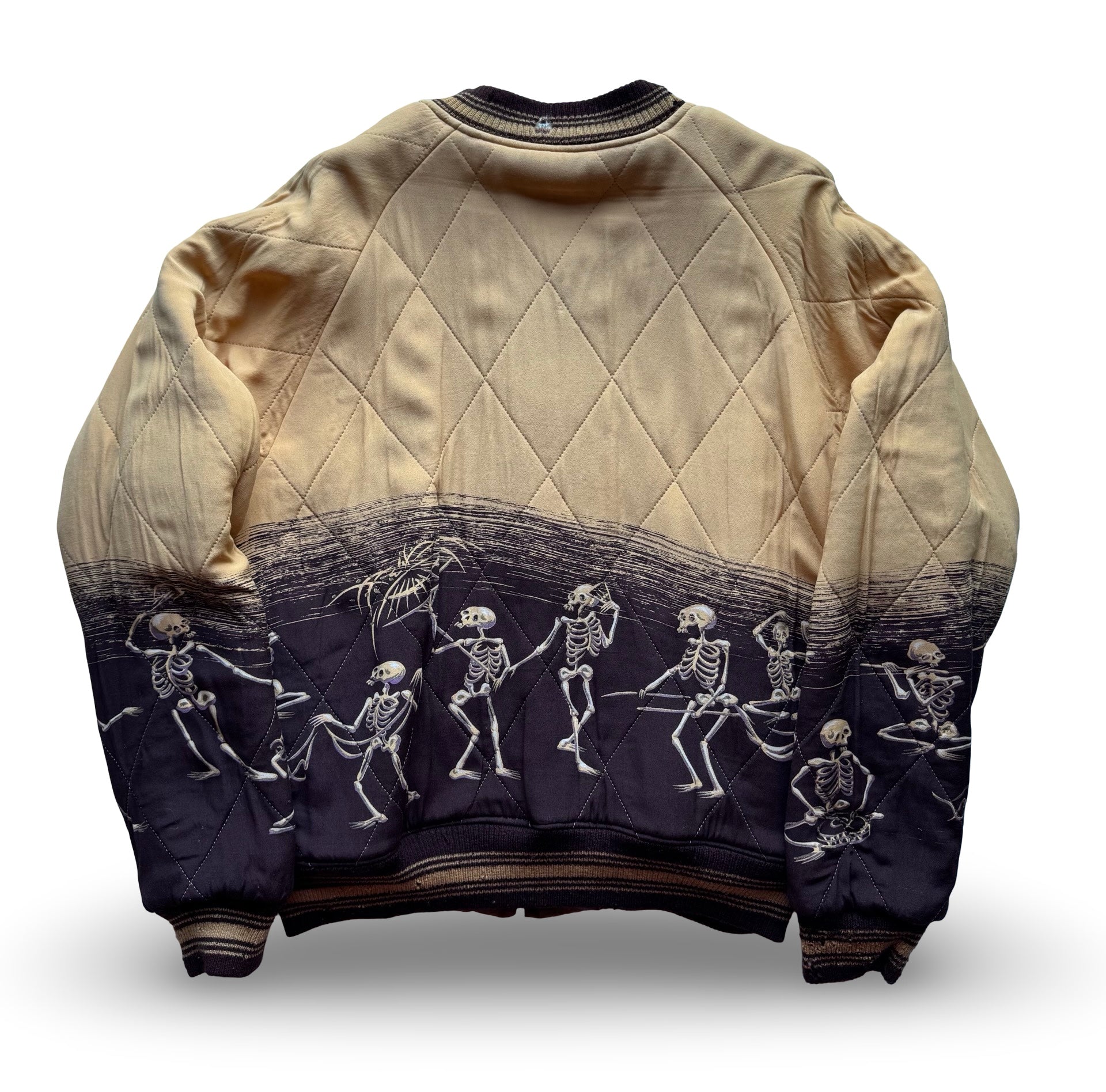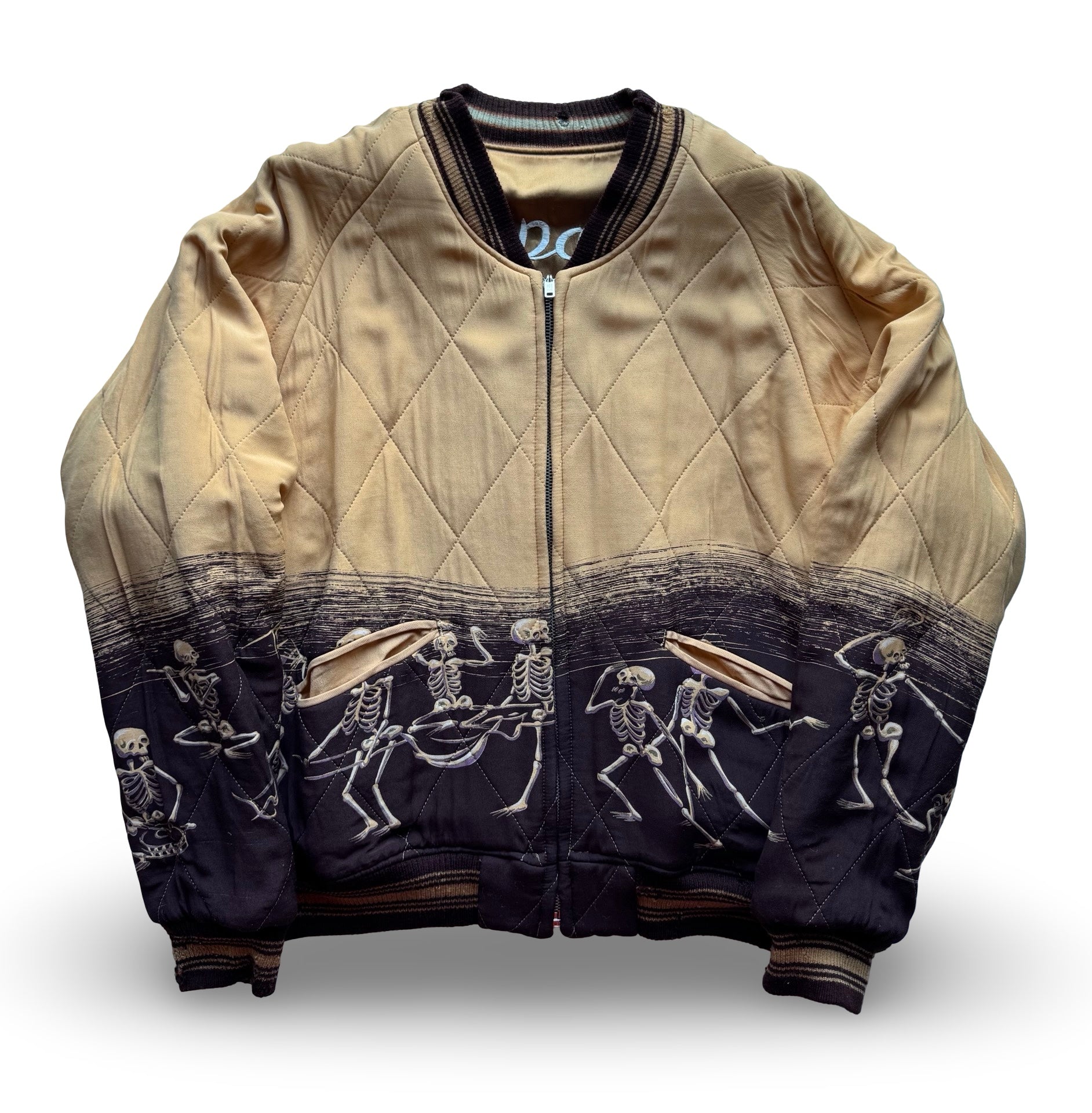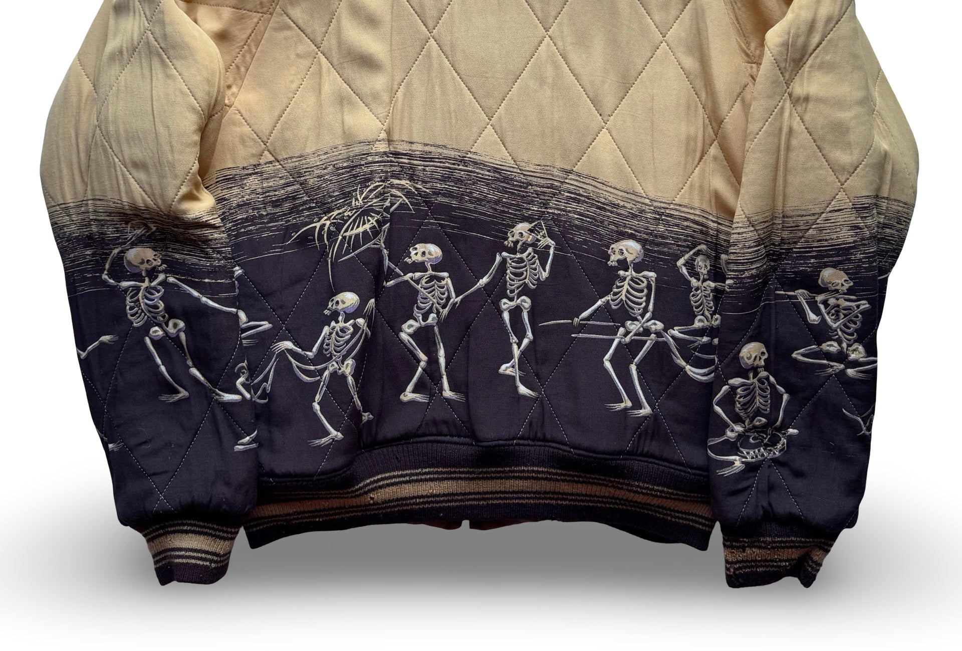 Flip the jacket over, and a completely different world comes alive. The second side features a beautifully quilted beige-and-black body, transforming into a flowing procession of skeletons — a playful yet culturally rich motif inspired by traditional Japanese folklore and Edo-period art. This “skeleton parade” design is coveted among sukajan enthusiasts, and Pherrow’s execution is exceptionally faithful to classic hand-drawn aesthetics.