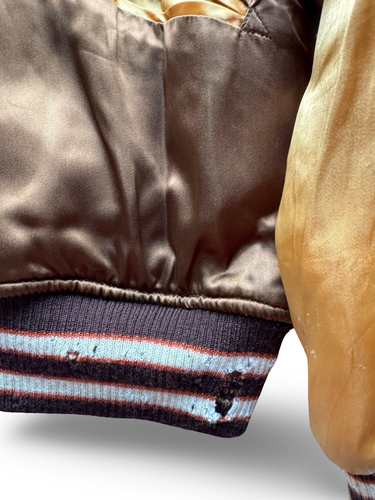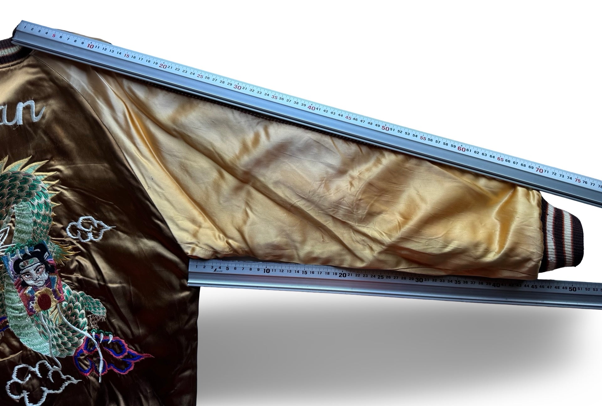 On the first side, a deep brown satin canvas sets the stage for a spectacular hand-embroidered dragon coiled protectively around a warrior figure — a classic motif steeped in Japanese legend. Metallic gold sleeves amplify its vintage glow, creating a dramatic contrast that instantly commands attention. The twin-dragon embroidery on the front balances power and symmetry, embodying everything collectors love about old-world Yokosuka artistry.