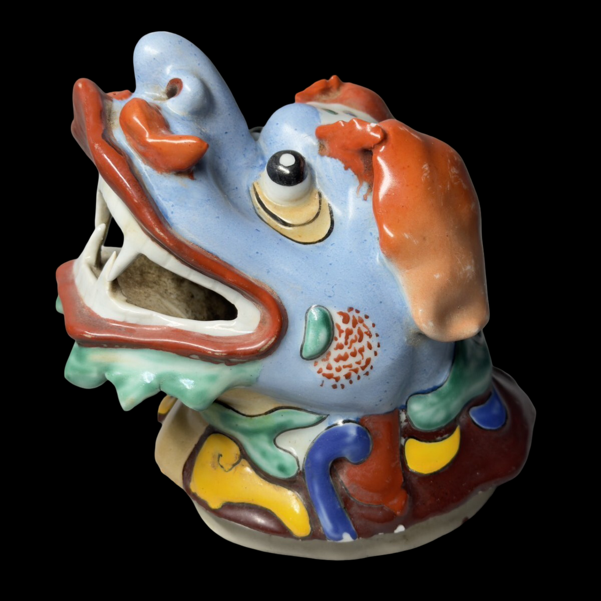 The exact kiln, period, and regional attribution are not documented in the listing. We are presenting this as a Japan-market polychrome ceramic Shishi incense burner okimono, and we recommend treating any style labels as descriptive rather than definitive.