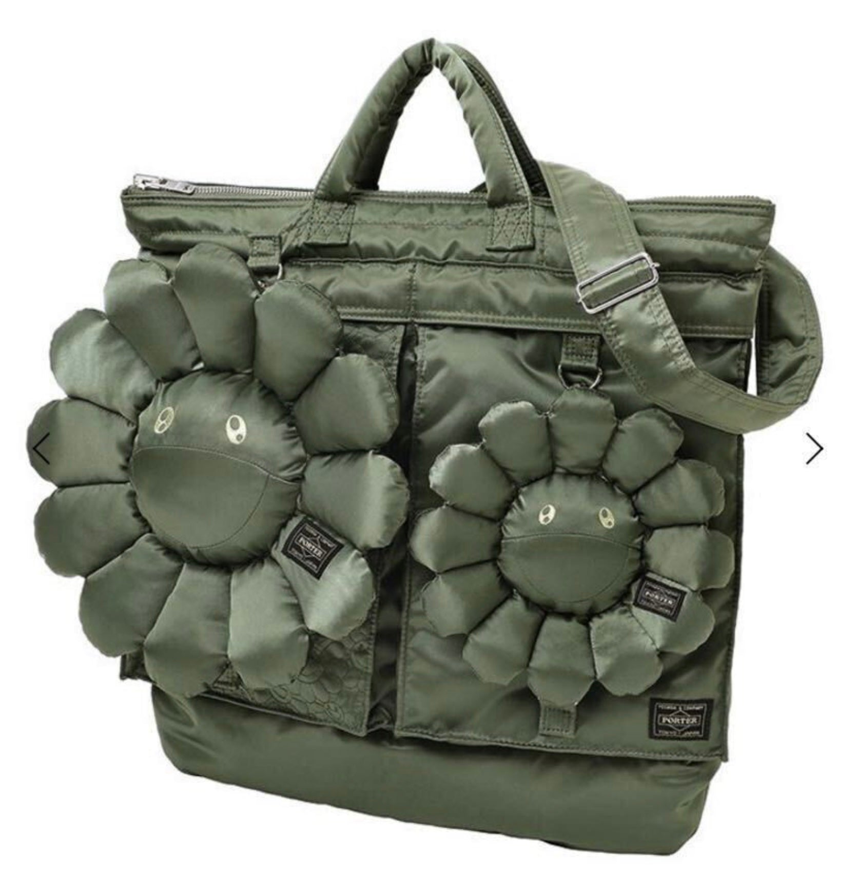 Murakami’s iconic smiling flowers—symbols of optimism, Superflat philosophy, and contemporary Japanese pop art—are meticulously crafted in dimensional nylon, creating a soft sculptural effect against PORTER’s signature twill. The khaki palette grounds the piece with military heritage while allowing the floral motifs to shine with subtle charisma.