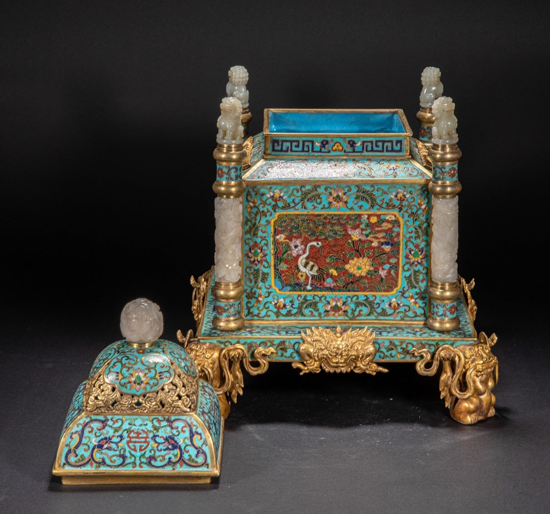This cloisonné incense burner exemplifies the late-imperial Chinese decorative tradition in which metalwork, enamel, and hardstone carving are unified into a single architectural object. The form follows square, pavilion-like proportions associated with palace ritual burners, elevated on stylized feet and framed by vertical jade columns that function as both visual anchors and symbolic guardians.