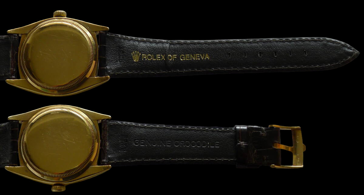 Mechanically, the watch retains superb health with steady amplitude and strong stability—an impressive survival for a 70-year-old Oyster automatic. Paired with a Rolex original crocodile strap and an 18K YG Rolex buckle, the watch remains a complete and highly coherent vintage ensemble.