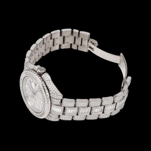 The Rolex GMT-Master II 116769TBR stands among the most exalted stone-set references ever produced by the Crown. Crafted in 18K white gold and paved with factory-set baguette diamonds across the bezel, case, dial, and bracelet, it represents the apex of Rolex gem-setting mastery—an arena where only a handful of artisans are certified to work.