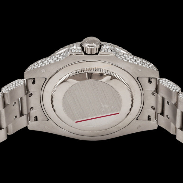 This example presents with exceptional clarity and sharpness across its diamond surfaces, retaining strong geometry along the case flanks and bracelet links. The dial, a full pavé field of diamonds, maintains a luminous, crystalline depth that refracts light with remarkable purity. The GMT complication, 100m water resistance, and automatic movement remain integral, confirming the identity of the Rolex Professional lineage even at its most opulent expression.