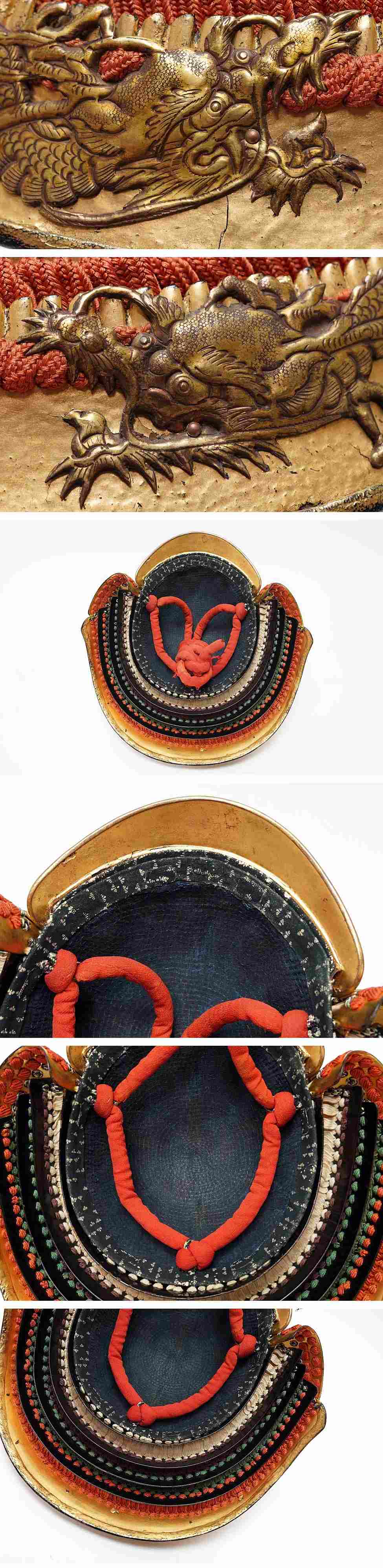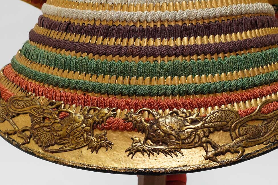 The dominant finish is black lacquer over iron and hardened-leather elements. Historically, this palette is both practical and philosophical: lacquer shields surfaces from humidity and handling, while black communicates restraint, seriousness, and command. In many Edo-period suits, the “color” is intentionally understated so that form, crest, and metalwork carry the voice of the armor. Here, that voice becomes vivid through dragon-carved decorative fittings and gilt-toned accents. In warrior iconography, dragons are not simply fantastical creatures; they symbolize commanding energy—water, storm, and unseen force—protective power that moves between worlds. When dragon hardware appears on armor, it functions as both ornament and talisman: a statement that this suit is meant to be seen, and meant to protect.
