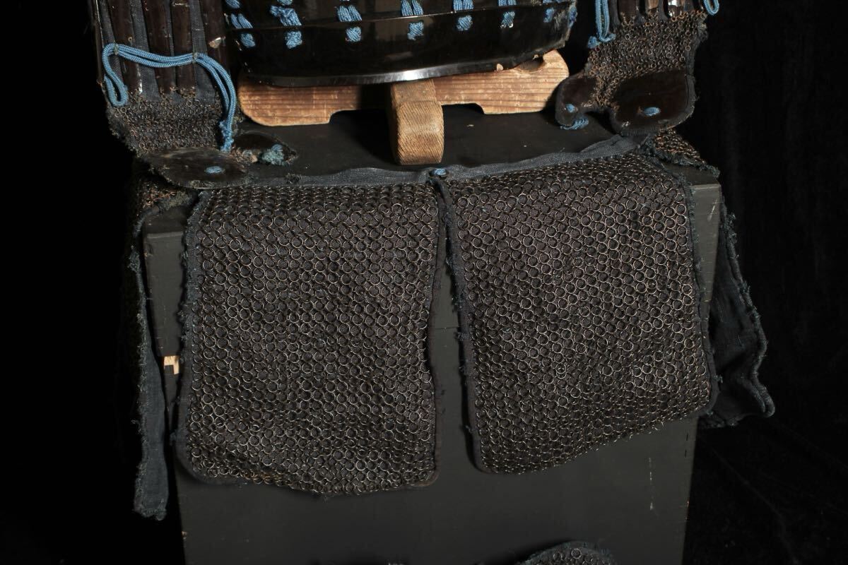 This piece presents as a coherent kusari gusoku: a full-body samurai armor ensemble built around kusari—iron chainmail—paired with plate elements in the classic logic of Japanese bugu (martial equipment). In Japanese armor practice, chainmail does not replace plate; it completes it, forming a flexible defense over the body’s articulation zones—where movement demands gaps and vulnerability follows.