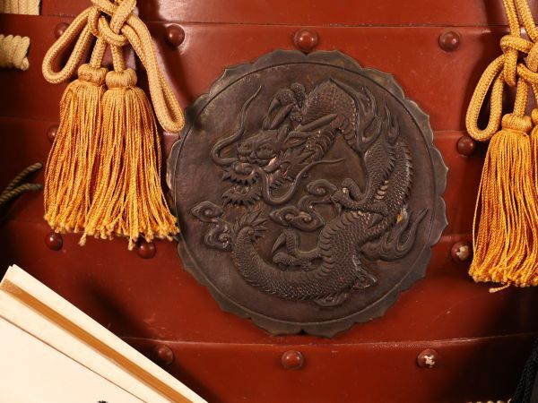 The iconography deserves special attention. The “dragon wrapped around a ken (ritual sword)” motif is widely recognized in Japanese visual language as a Kurikara-style emblem: a dragon coiling around a blade to embody the subjugation of obstacles and the transformation of chaotic force into disciplined protection. In historical religious contexts this imagery is closely associated with the Fudo Myoo tradition, where the sword signifies the cutting-through of delusion and the dragon expresses power harnessed rather than unleashed. As a maedate, it functions like a heraldic statement—protective, theatrical, and unmistakably legible from across a room.