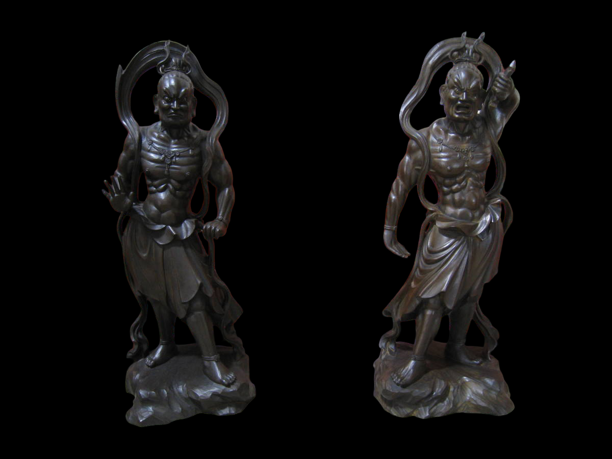 A formidable pair of temple guardians representing Agyo and Ungyo, the threshold protectors traditionally stationed at the entrances of Buddhist precincts. Cast in bronze with pronounced anatomical modelling and dynamic drapery, the figures translate the immediacy of carved wood prototypes into the permanence of metal: taut musculature, tightened brows, and the unmistakable surge of forward motion that defines the classic guardian stance.