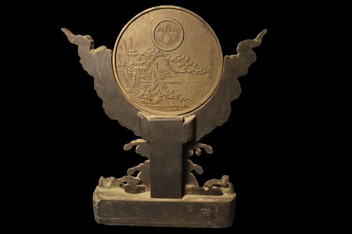 Temple Ritual Bronze Mirror with Wave & Cloud Carved Wood Stand — Edo to Early Meiji Japanese Buddhist Furnishing Object