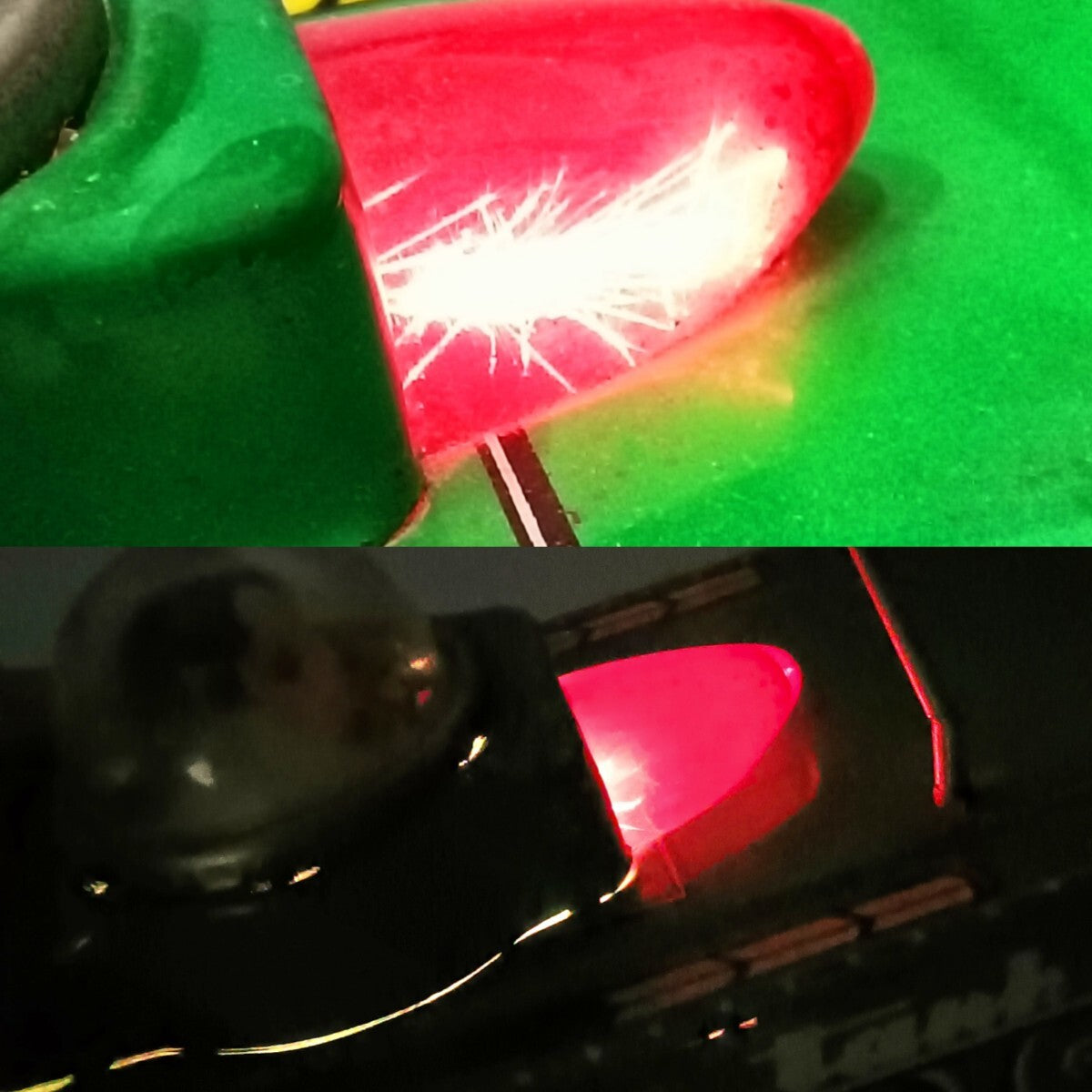 The streamlined tank body is finished in bold green with graphic track detailing and expressive lettering, while a clear dome canopy reveals the seated pilot figure within. When engaged, the internal mechanism activates a glowing red ignition element accompanied by visible sparks, transforming the toy from static object into kinetic spectacle.
