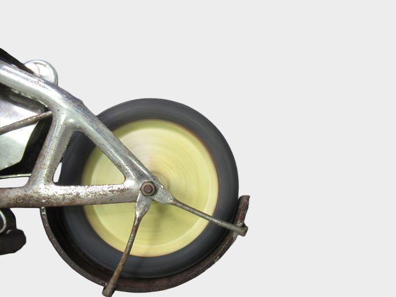 Unlike later lithographed fantasy motorcycles, this example prioritizes structure over ornament. Heavy-gauge tinplate construction, riveted and folded components, and an exposed drive assembly emphasize the machine itself rather than narrative embellishment. The pale-toned wheels, substantial frame, and elongated proportions give the object a sculptural presence uncommon among surviving tin vehicles.