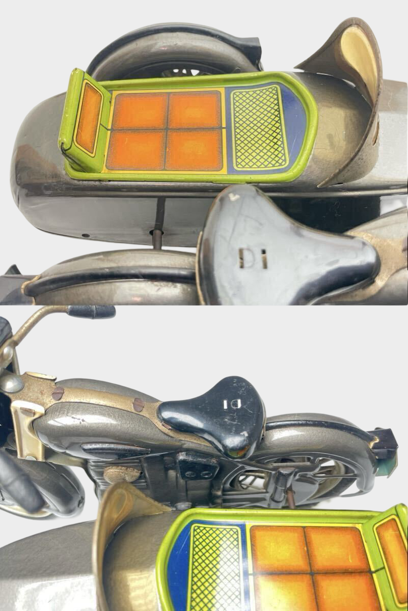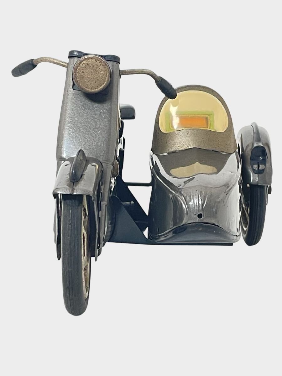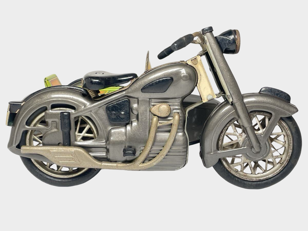 Design details elevate this piece beyond novelty. The sidecar body reads as an aerodynamic capsule; the cockpit windscreen adds a modernist gesture; and the overall geometry feels closer to postwar industrial styling than to cartoonish play forms. In a display context, it sits naturally among Showa transportation toys—buses, scooters, rockets, and early “space age” vehicles—while also appealing to motorcycle enthusiasts who collect miniature interpretations of classic road culture.