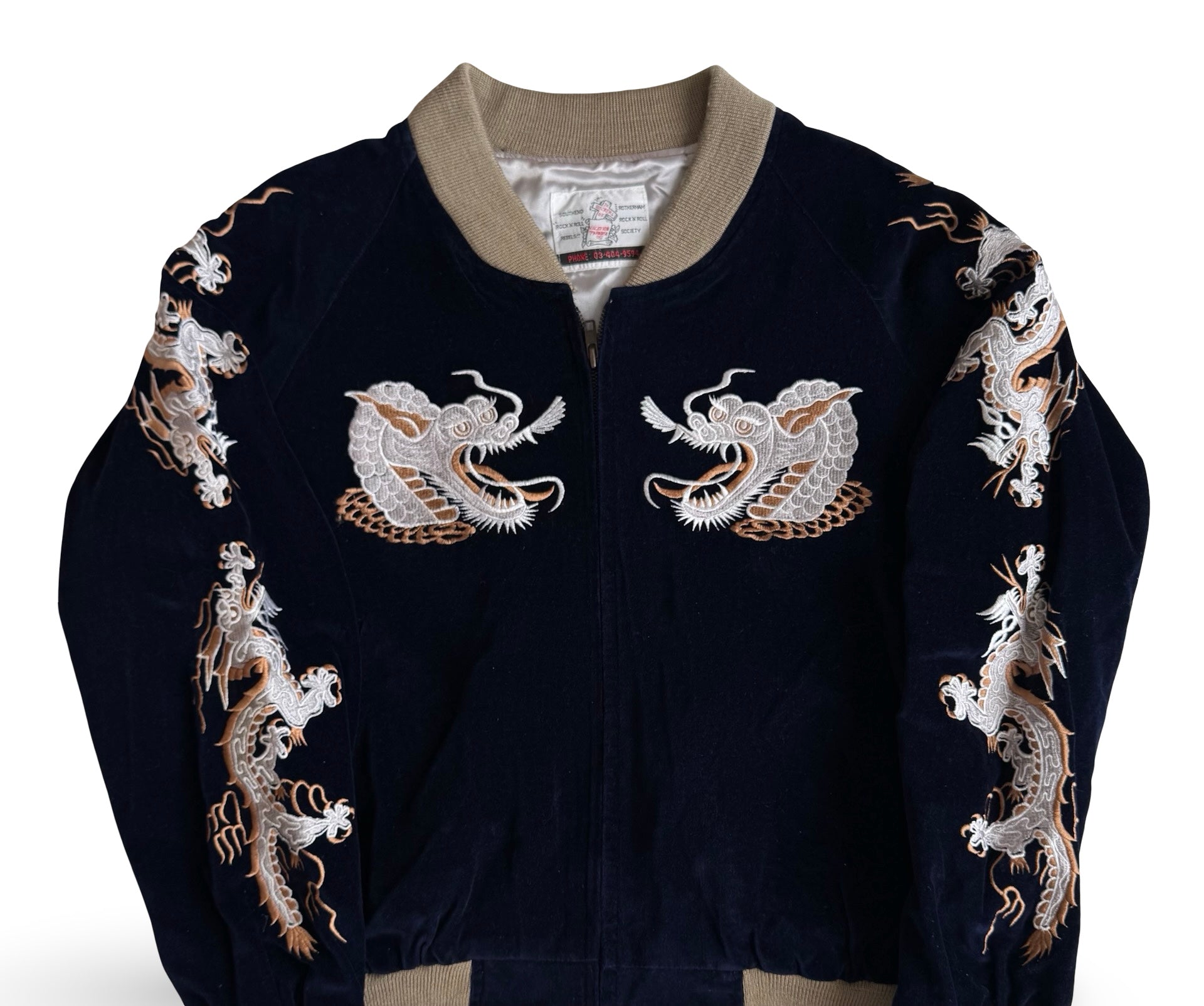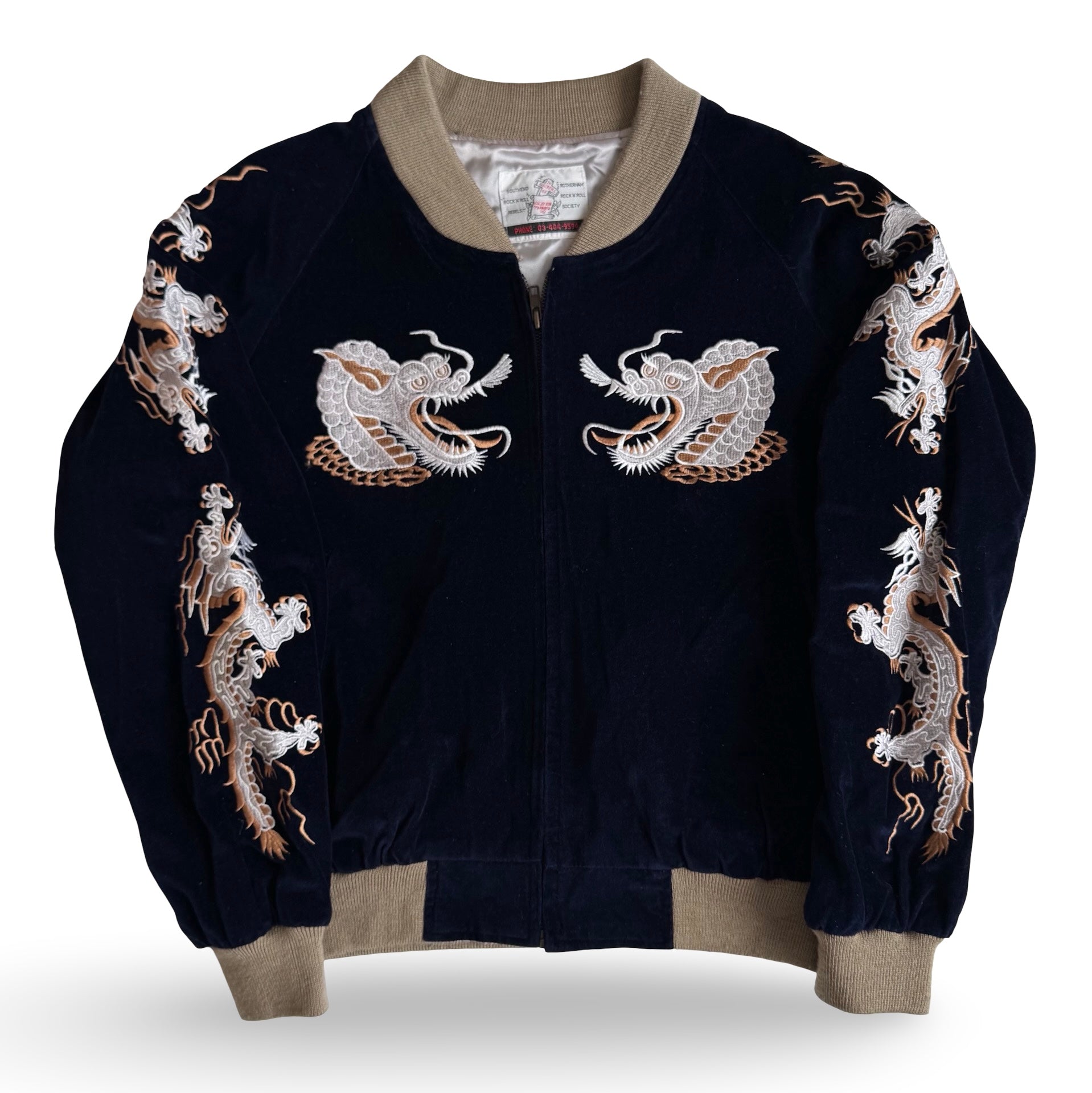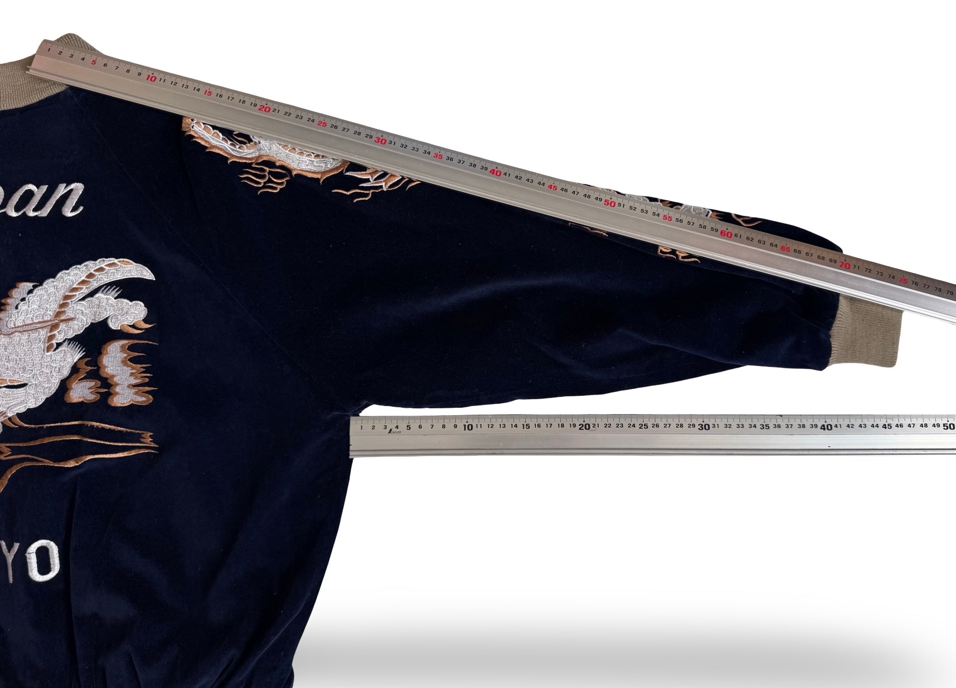 Step into the quiet storm of Japanese mysticism with this vintage velvet sukajan, featuring a breathtaking hand-embroidered White Dragon descending over Tokyo. Crafted from deep midnight velvet, the fabric catches light like lacquered ink, creating a soft glow that enhances the motion of the gold-tinted scales and swirling clouds.