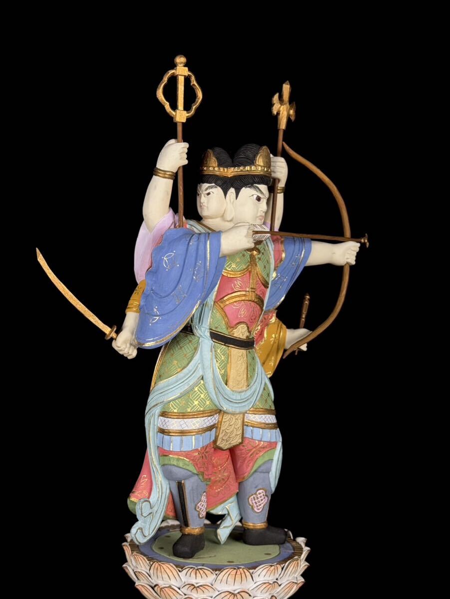 Polychrome Marishiten sculptures are uncommon and sought after for their dynamic iconography and vivid ritual presence.