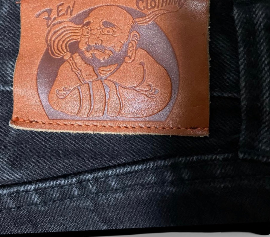 The denim itself carries a soft-worn structure that enhances the artwork without overshadowing it. Its blackened tone serves as the perfect backdrop for the dragon’s luminous highlights, creating a dramatic contrast. The silhouette follows a straight, easy fit typical of Japanese workwear denim—neither too slim nor overly loose—making it a versatile cut for modern styling while still offering room for comfort.