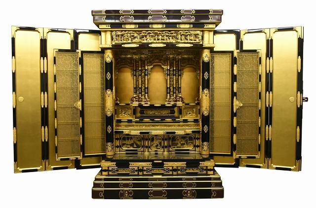 Closed, the black lacquer exterior reads as formal architecture: quiet, protective, and composed. Opened, the interior becomes luminous and legible, converting the cabinet into a sanctuary wall. That transformation is one of the defining aesthetic technologies of the gold butsudan tradition — and one of the reasons serious households, estates, and institutions choose large-format examples: they do not decorate a space; they establish it.