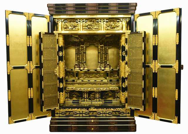 The exterior reads as black lacquer formality: a controlled shell that protects a luminous interior. This contrast is intentional. Closed, the cabinet is quiet and architectural. Opened, it becomes radiant, legible, and ceremonial. That transformation is one of the core reasons collectors, temples, and diaspora households prize large-format gold butsudan: it is both sanctuary and threshold.