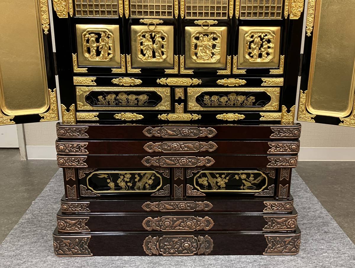 This altar presents in unused display condition, with surfaces and fittings retaining clarity consistent with controlled storage. Preservation priorities include controlled handling, humidity stability, gentle dust management, and avoidance of direct sunlight and heat sources near lacquer and gilt surfaces.