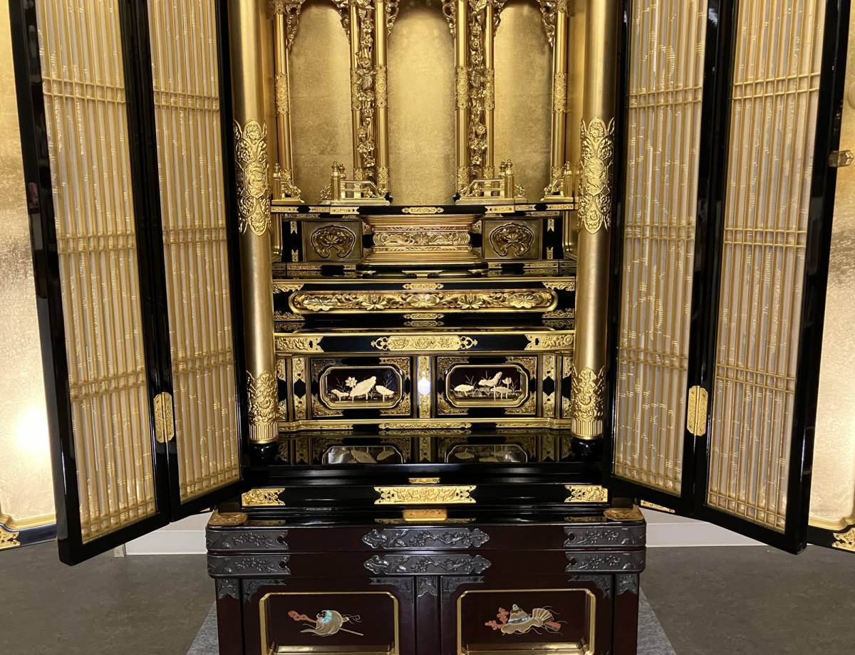 The altar presents in unused display condition, with surfaces, fittings, and interior elements exhibiting clarity consistent with controlled storage. Lacquer and gold surfaces appear intact, with no visible compromise to structural geometry.